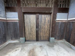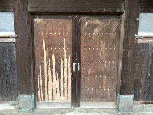 農家さんの古い門の引き違い扉 化粧べニアが剝がれていたため面材入れ替えと門西側焼杉板張替工事のご相談でした。